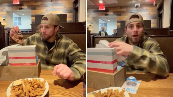 A restaurant pregnancy reveal went viral after a server delivered a wooden box like condiments. Josh thought it was sauces – until he opened it.