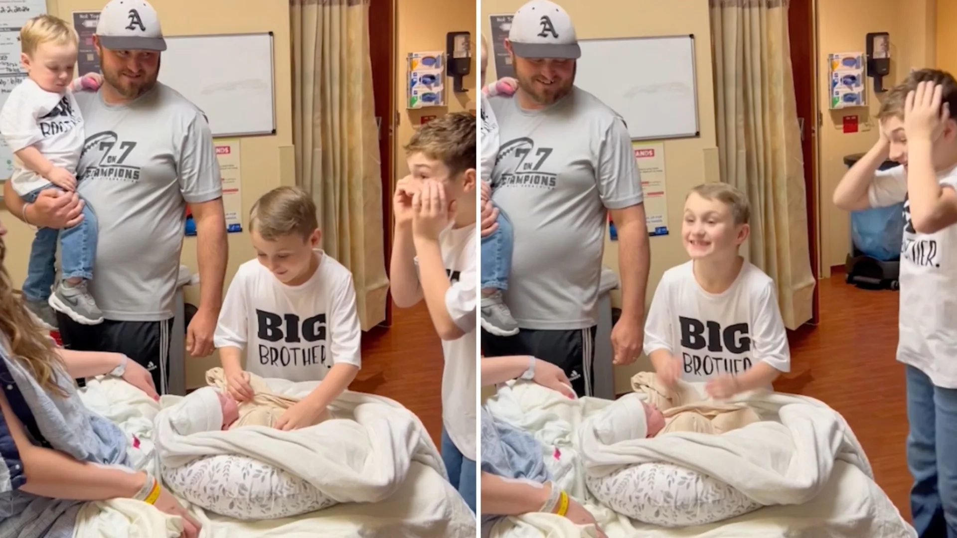 On February 3, a few hours after she had the baby, Layken, Liam and Lane entered the room wearing “Big Brother” t-shirts, with Madesta holding their sleeping sibling wrapped up on her lap.